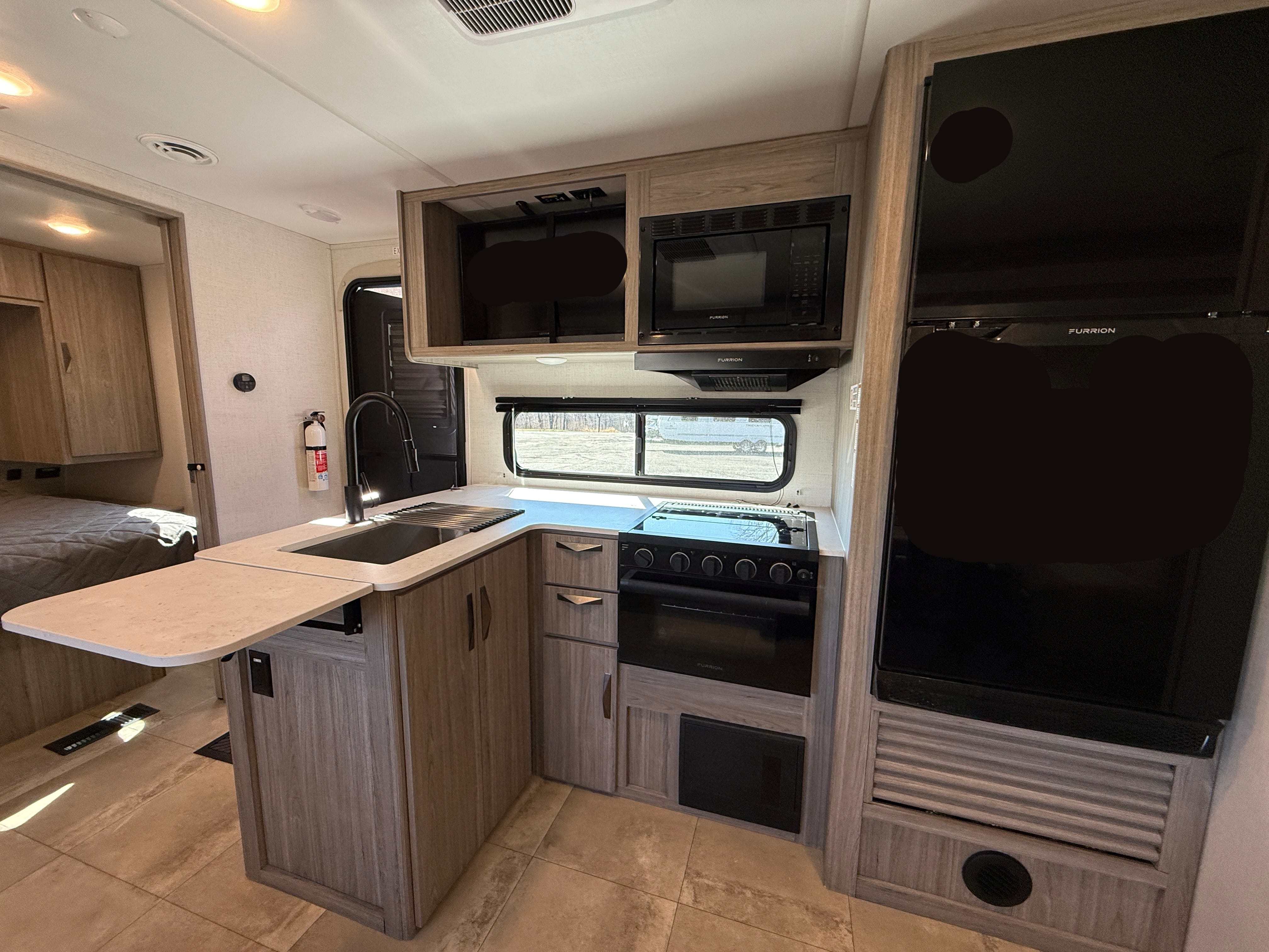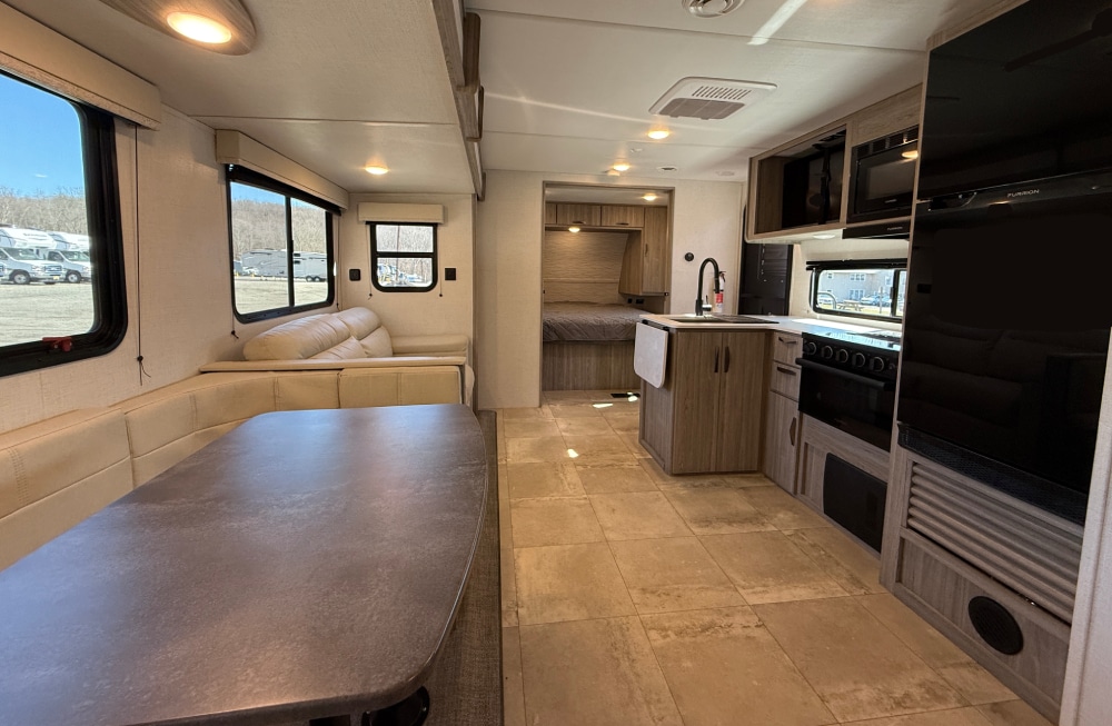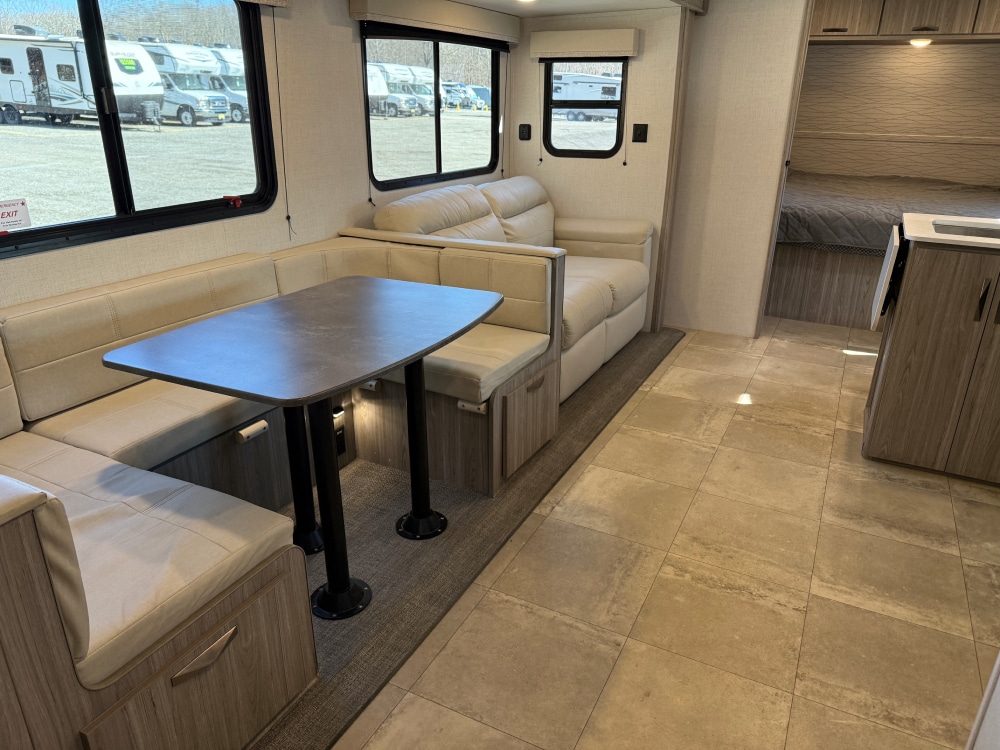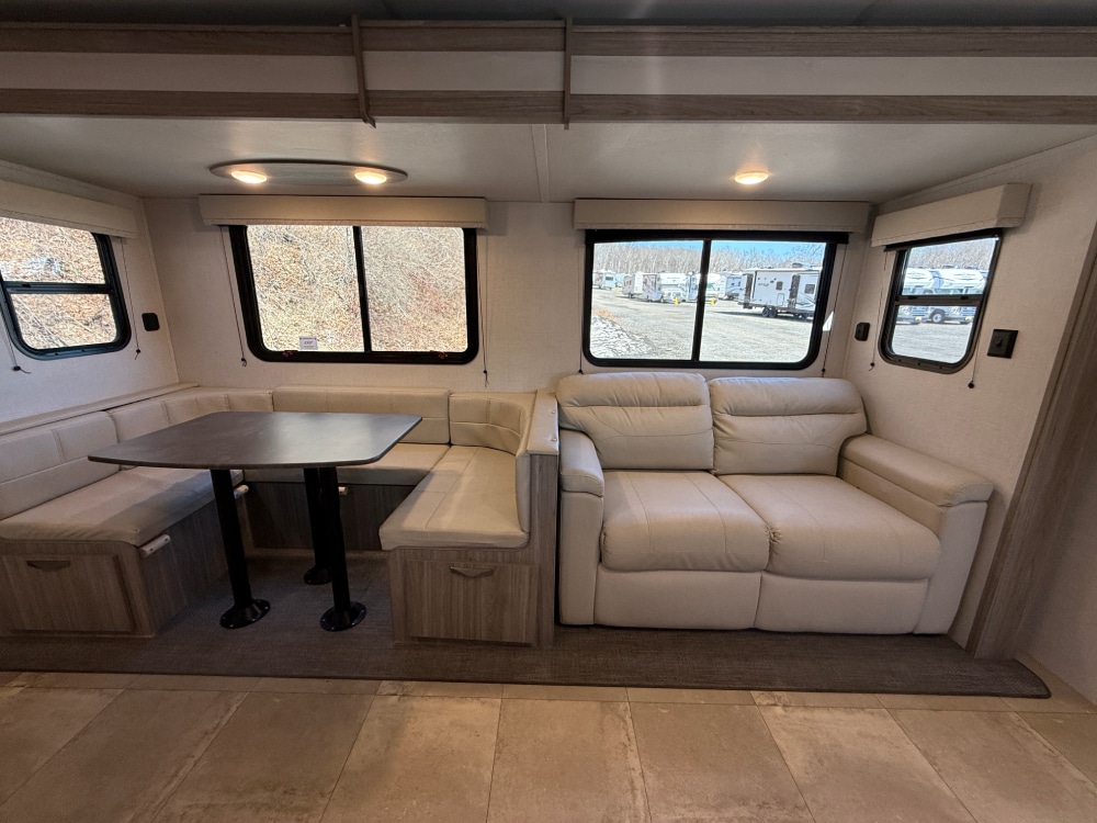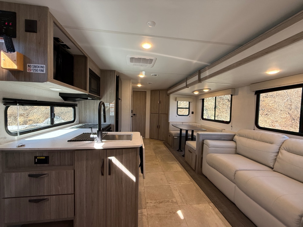This travel trailer features maximum sleep options with its queen-size bed up front in the private bedroom, four bunk beds back in the rear bunkhouse, and U-shaped dinette and tri-fold sleeper sofa in the main living area. The dinette and sofa rest on a large slide so that you have plenty of room as you spend time indoors, and the kitchen has everything you need to make all of your family's favorite recipes.