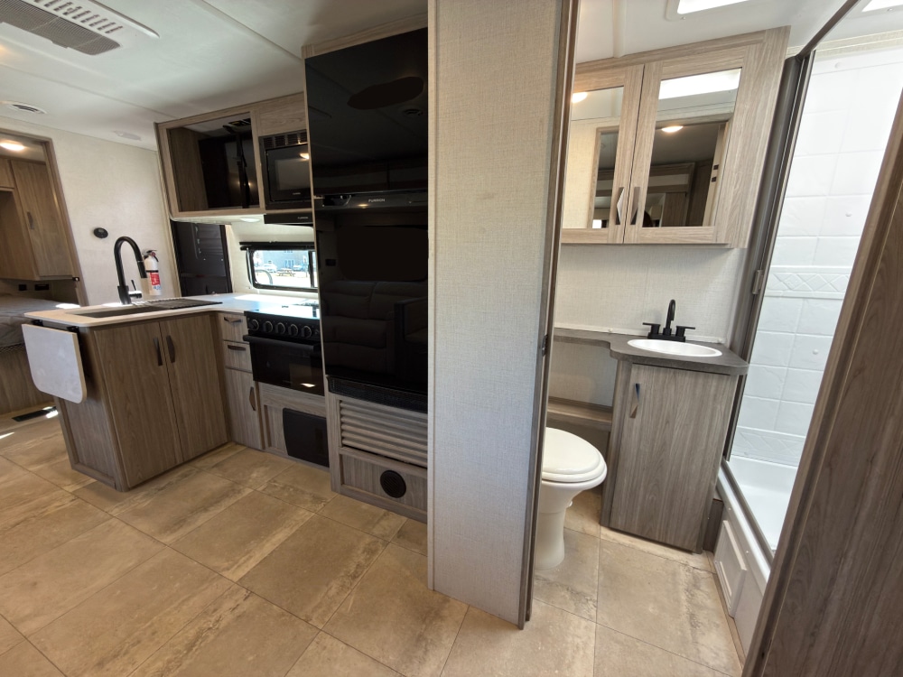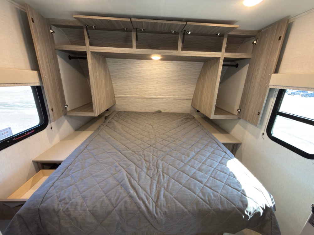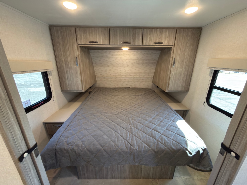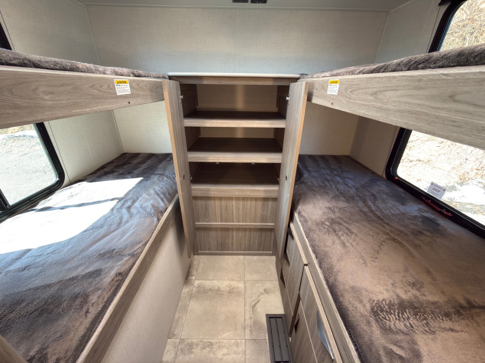 The Ultra-Lightweight Passport 282QB Bunk House Travel Trailer from Keystone RV has an amazing amount of storage capabilities with its two exterior pass-through storage compartments! Additionally, you’ll find excellent interior storage with the bedside wardrobes, bunkhouse storage, kitchen pantry, and bathroom linen closet.
