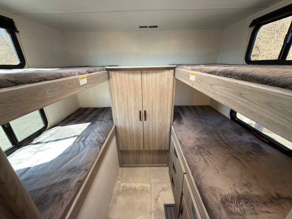 Rear Bedroom has 4 Twin Bunk Beds, Front Queen Bed.