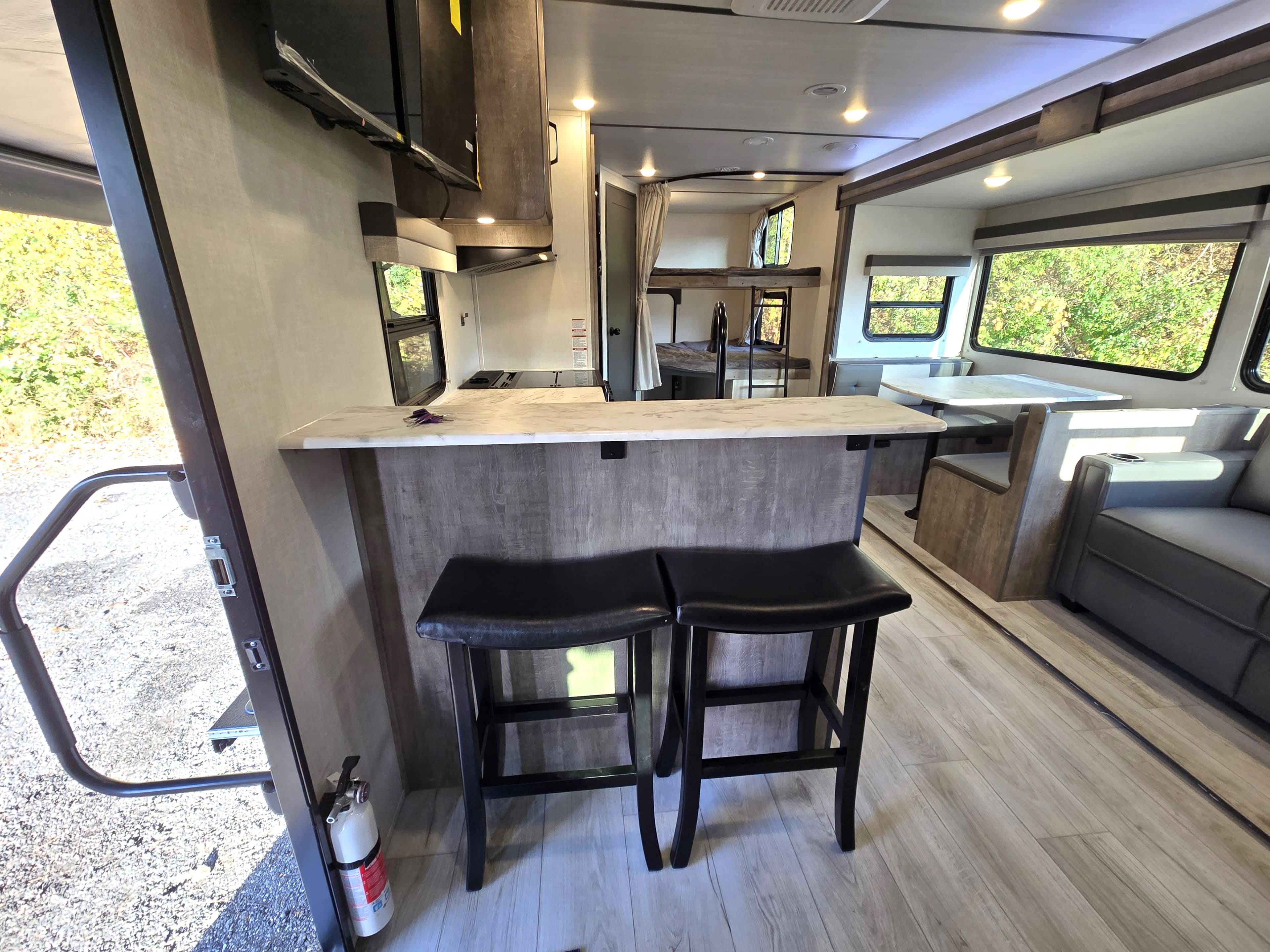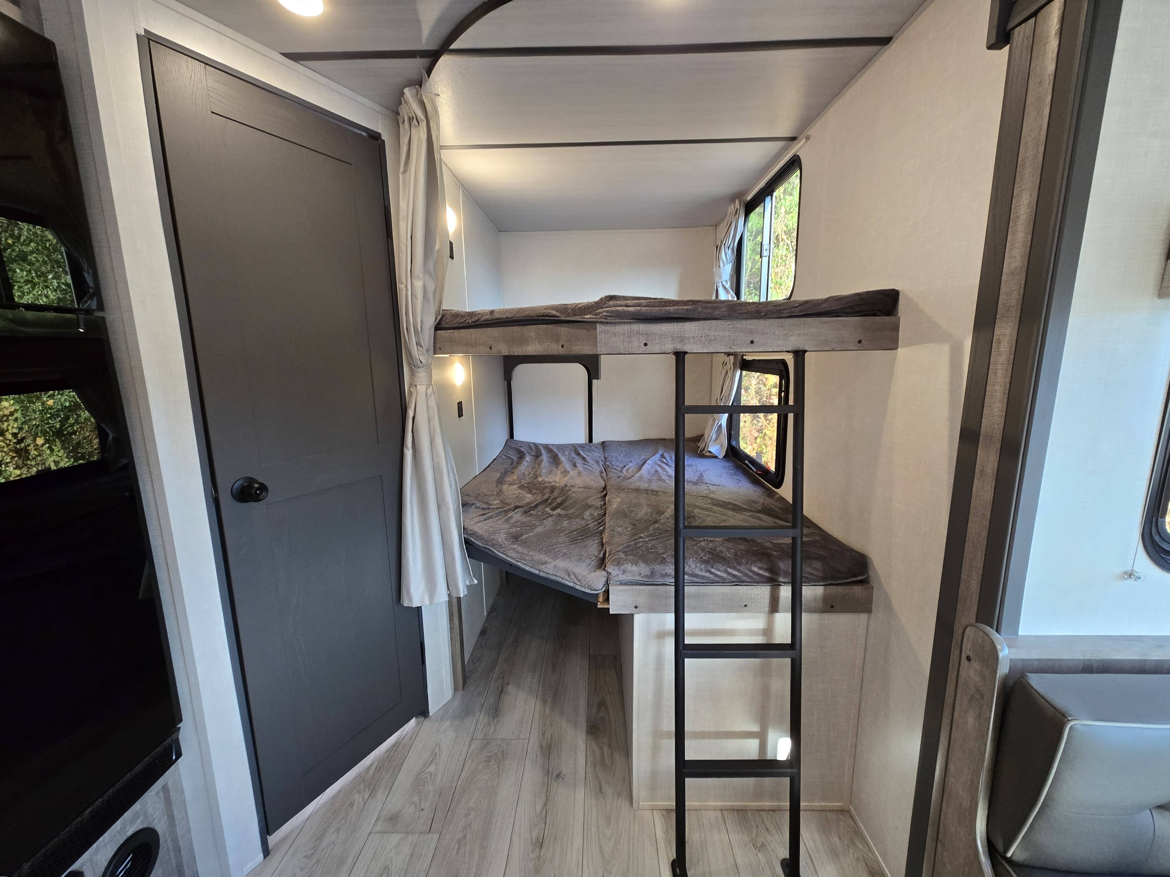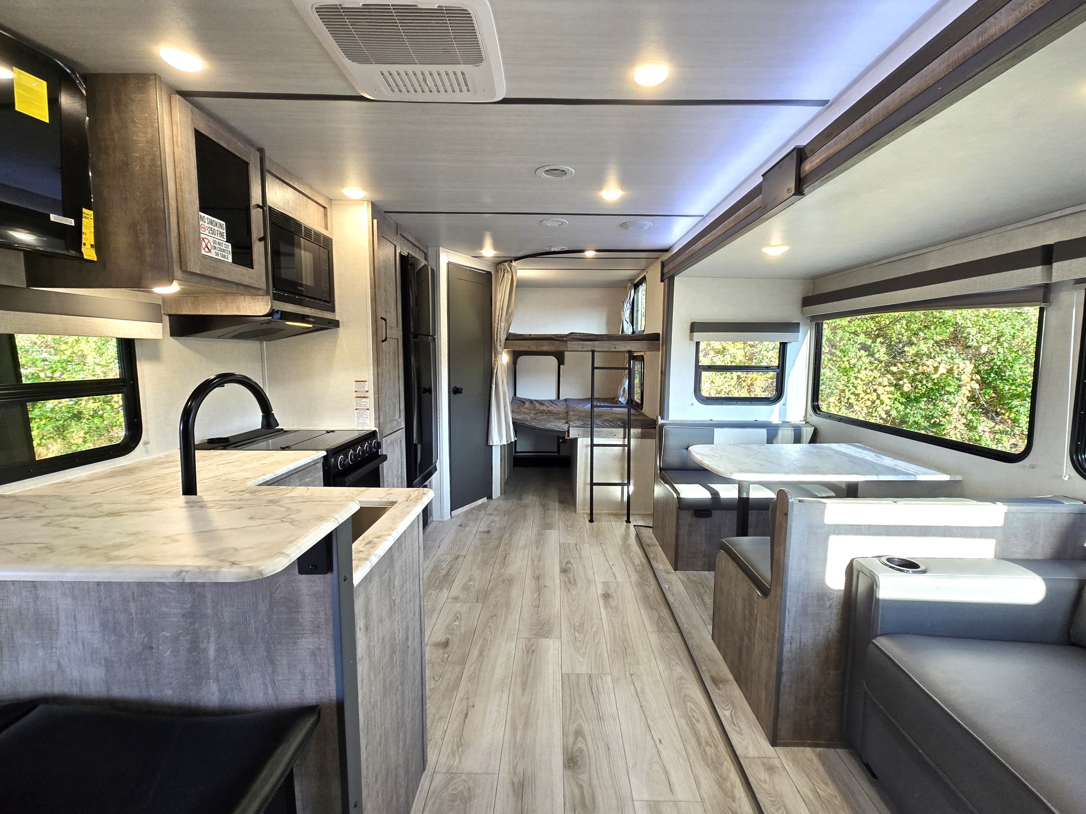 2 Double Bunks!! Has outdoor kitchen with gas griddle, sink, refrigerator and side shelf! Second door for private bathroom entrance! Sleeps 8, Super Slide Out, Dinette/Bed, Sofa Bed, Front Queen Bed, Full Kitchen with Stove/Oven and upgraded 12v 10 Cu Ft Fridge, Microwave, Pass Through Front Storage, Electric Roll Out Awning, Roof Mounted 80W Solar, Completely enclosed underbelly with Aluminum Side Walls - great for 4 season camping, Ducted 15k upgraded Air Conditioning and Heat, TST Tire Pressure Monitoring, and Central Vac System. ****No Doc/Prep/Dealer Fees