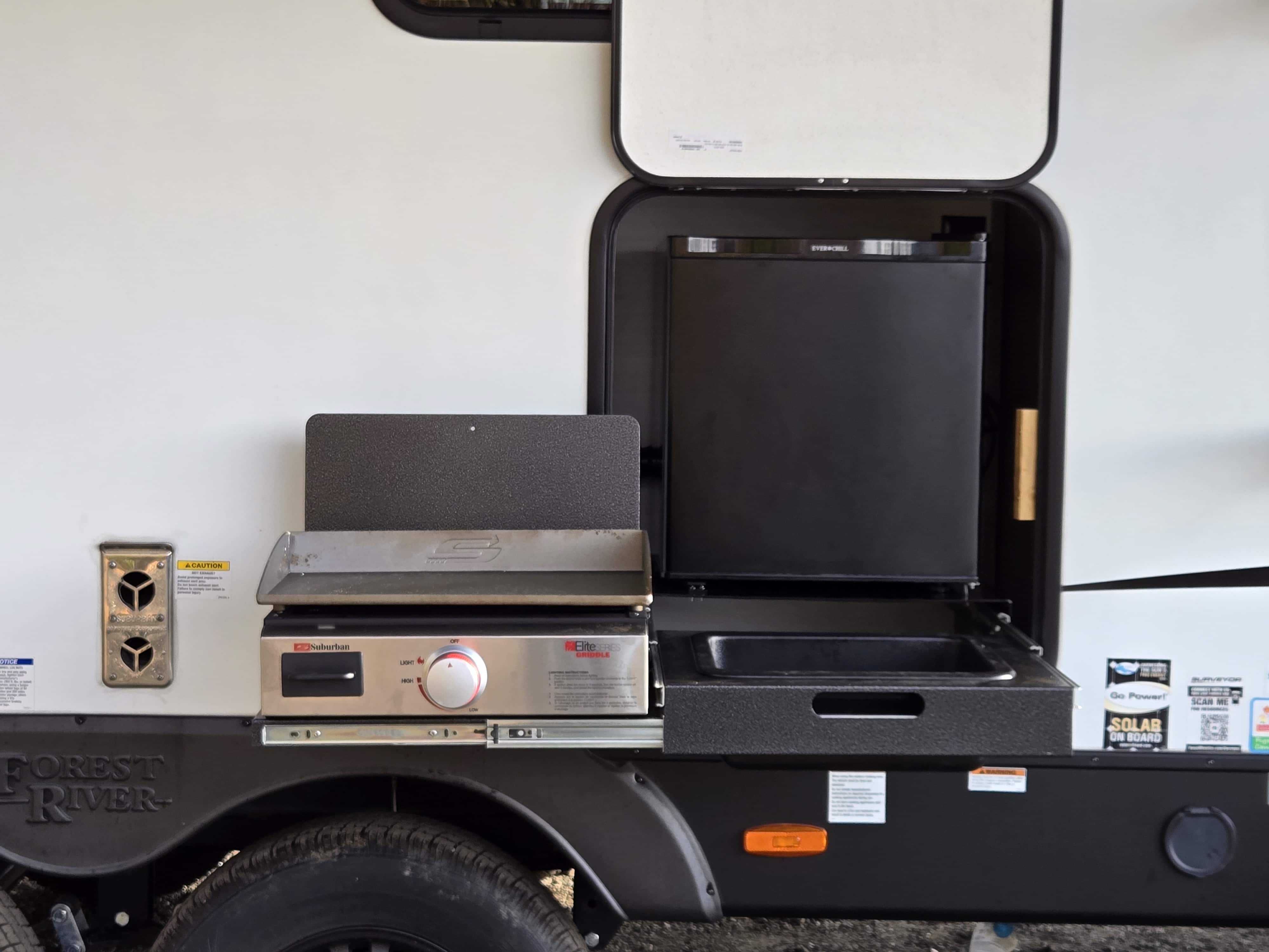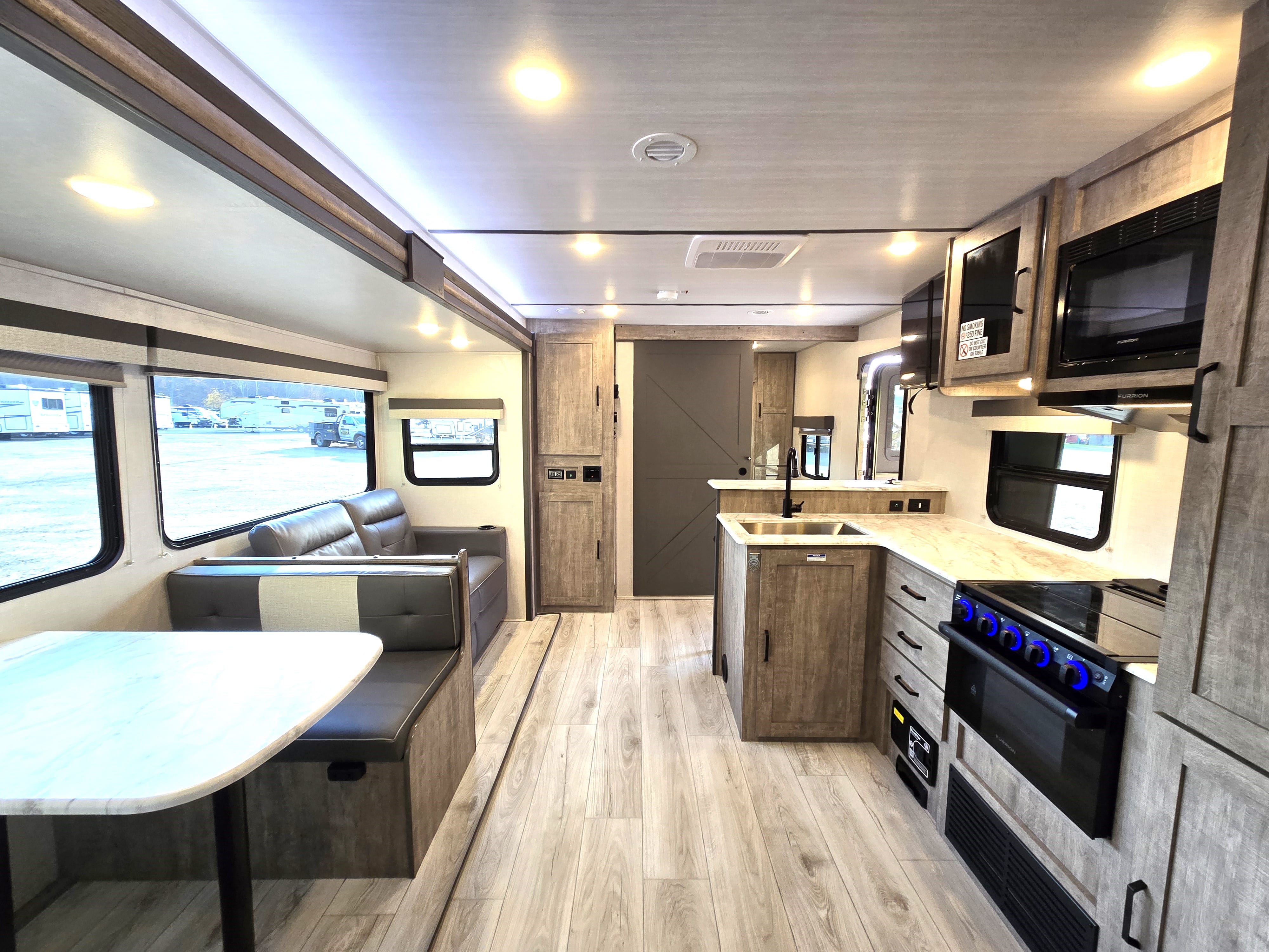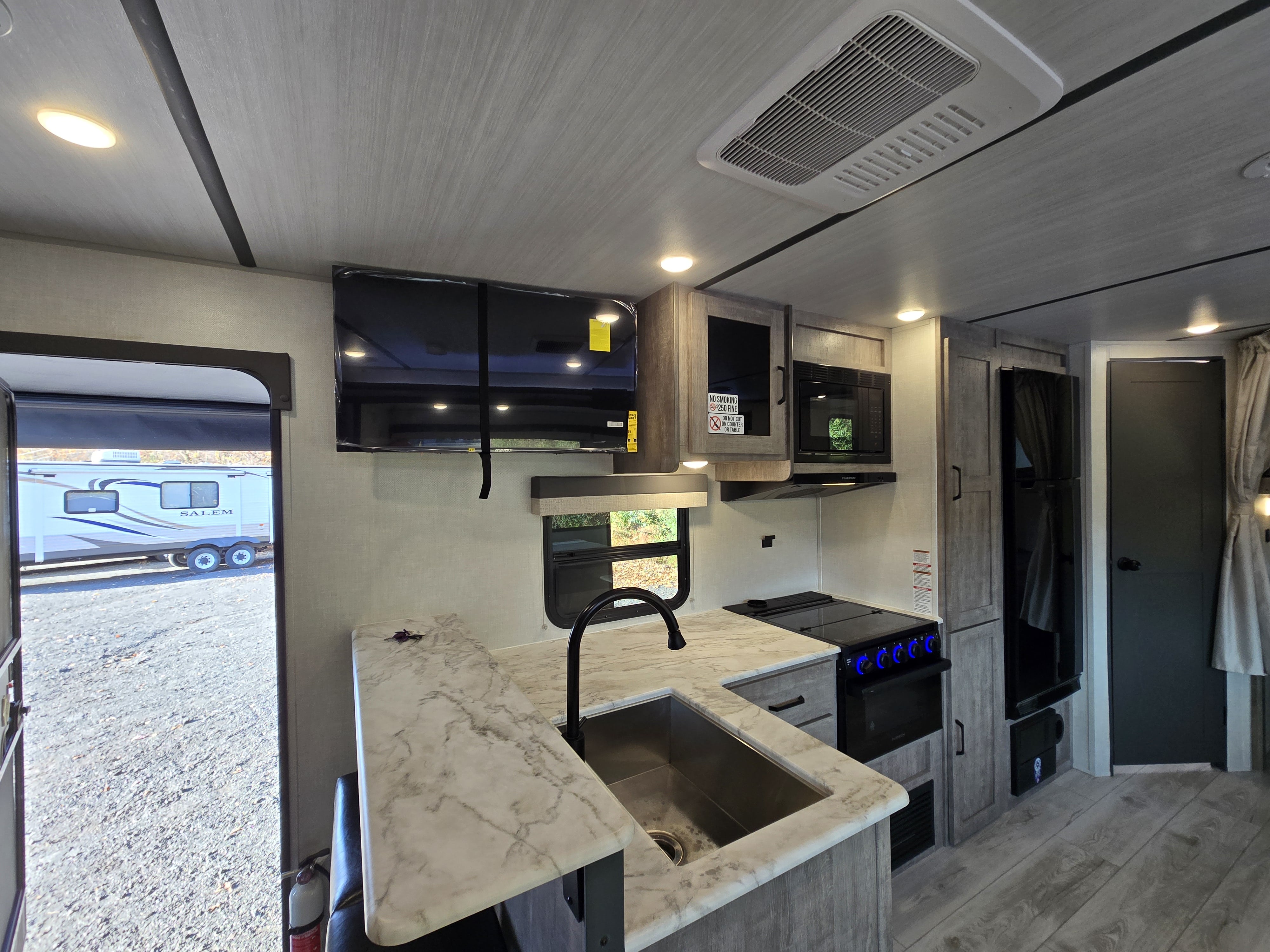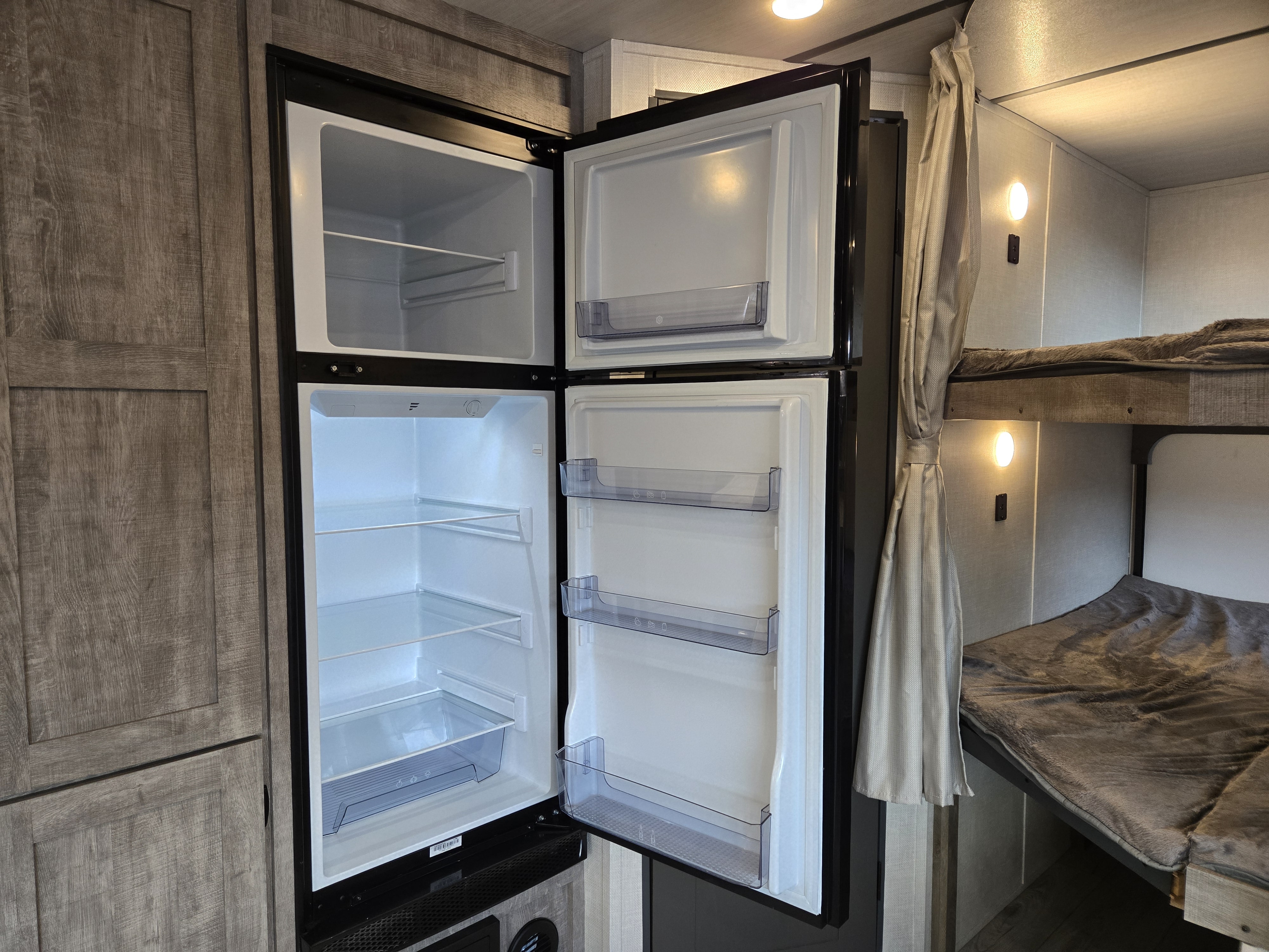 2 Double Bunks!! Has outdoor kitchen with gas griddle, sink, refrigerator and side shelf! Second door for private bathroom entrance! Sleeps 8, Super Slide Out, Dinette/Bed, Sofa Bed, Front Queen Bed, Full Kitchen with Stove/Oven and upgraded 12v 10 Cu Ft Fridge, Microwave, Pass Through Front Storage, Electric Roll Out Awning, Roof Mounted 80W Solar, Completely enclosed underbelly with Aluminum Side Walls - great for 4 season camping, Ducted 15k upgraded Air Conditioning and Heat, TST Tire Pressure Monitoring, and Central Vac System. ****No Doc/Prep/Dealer Fees