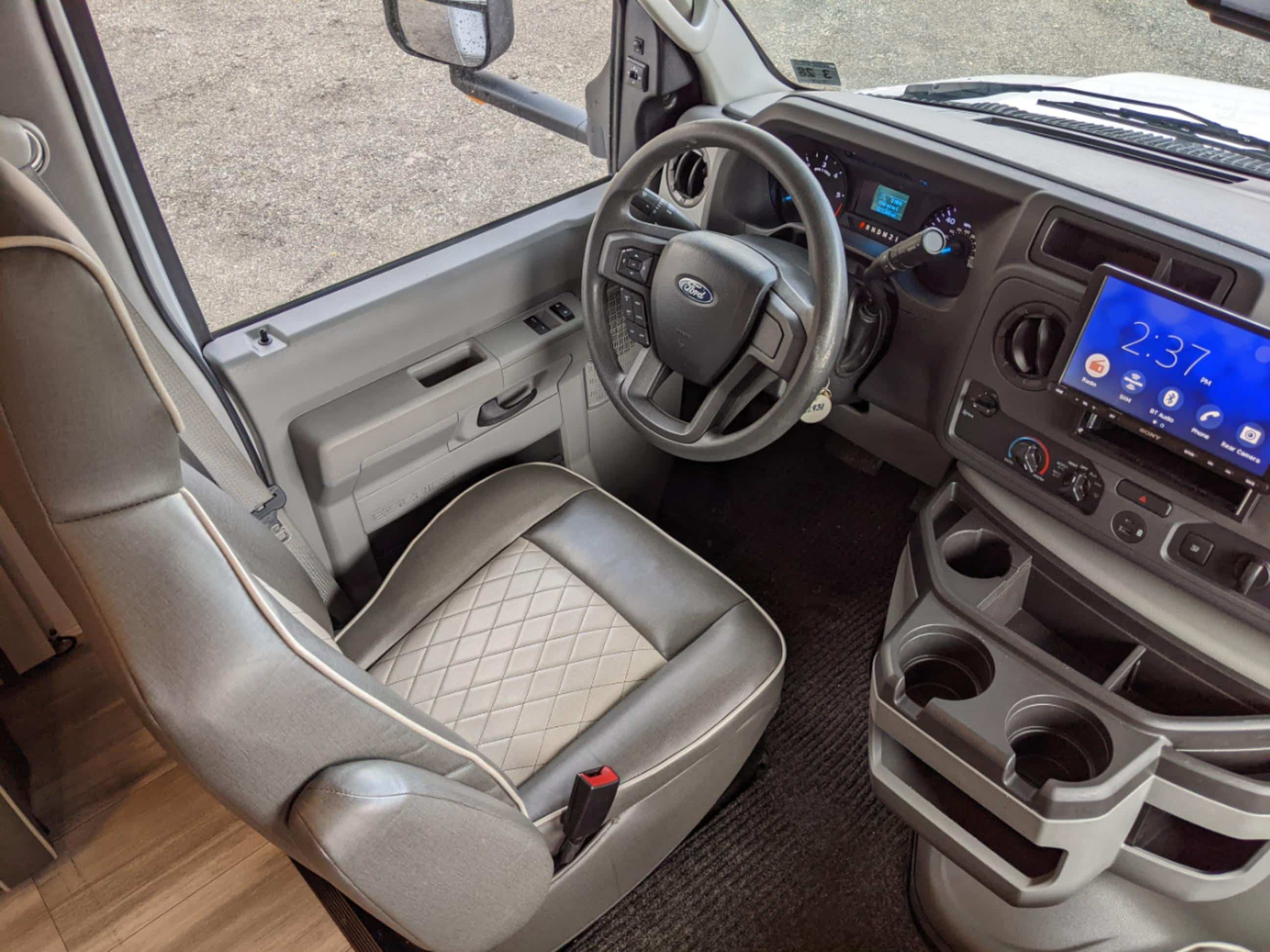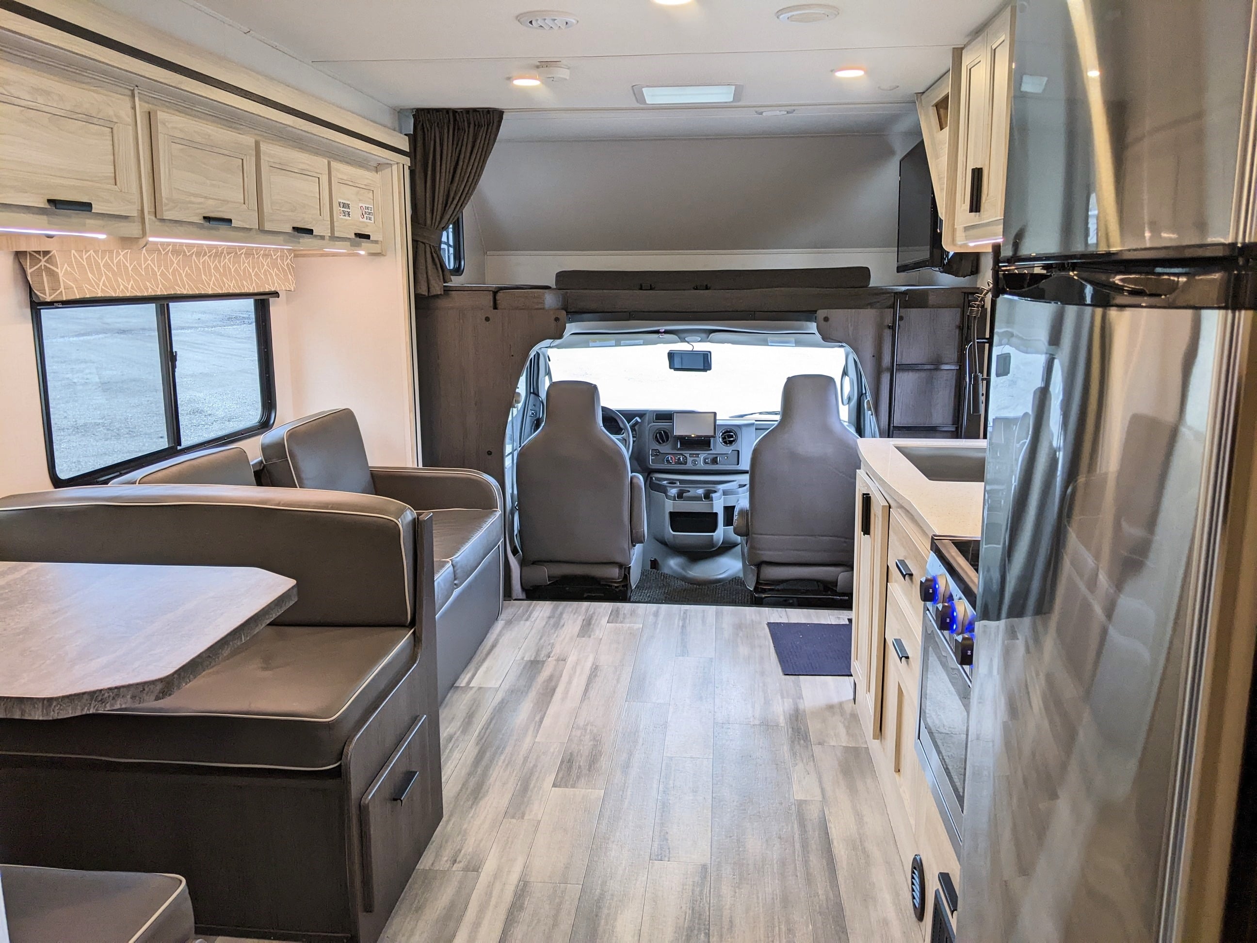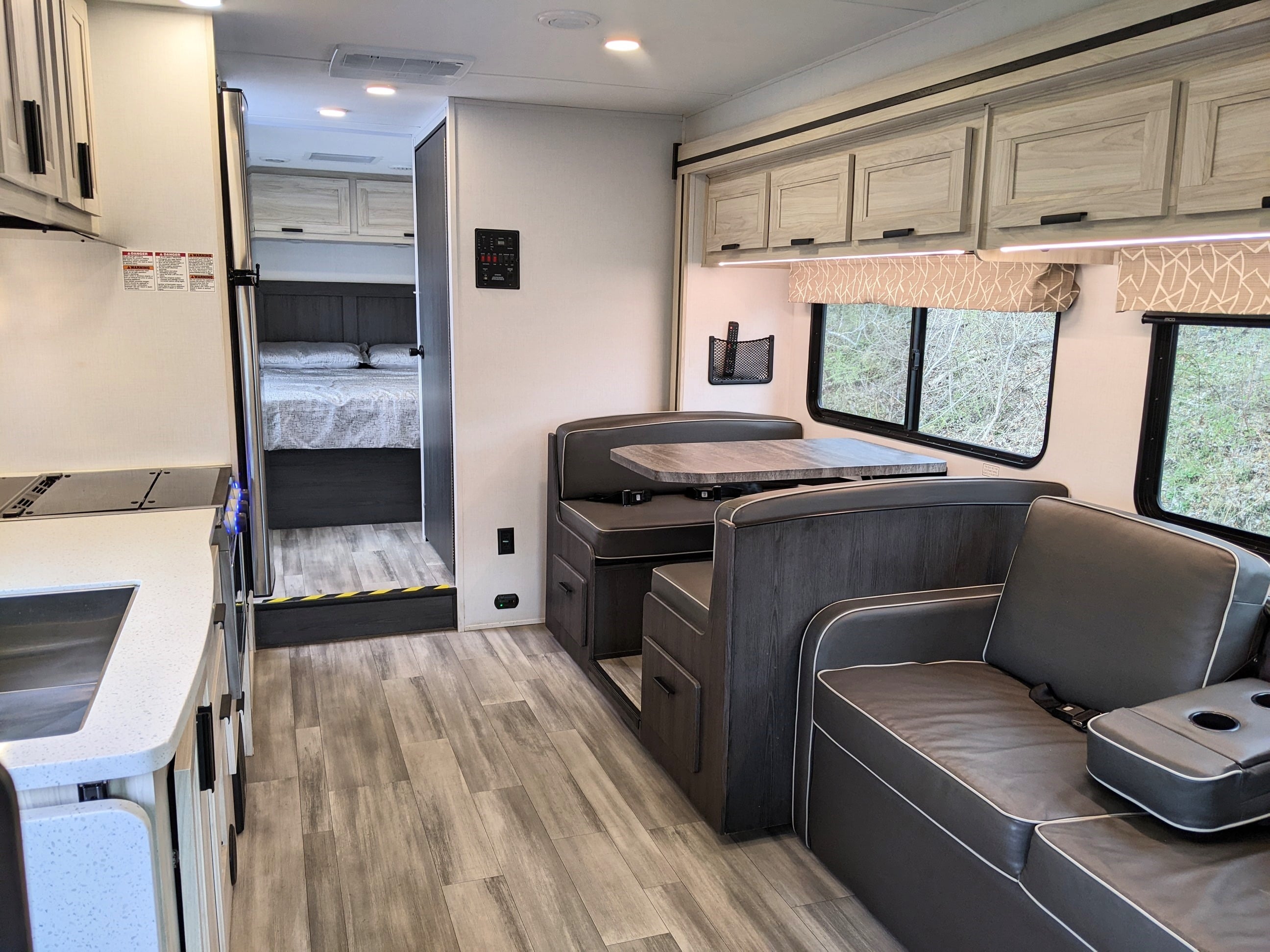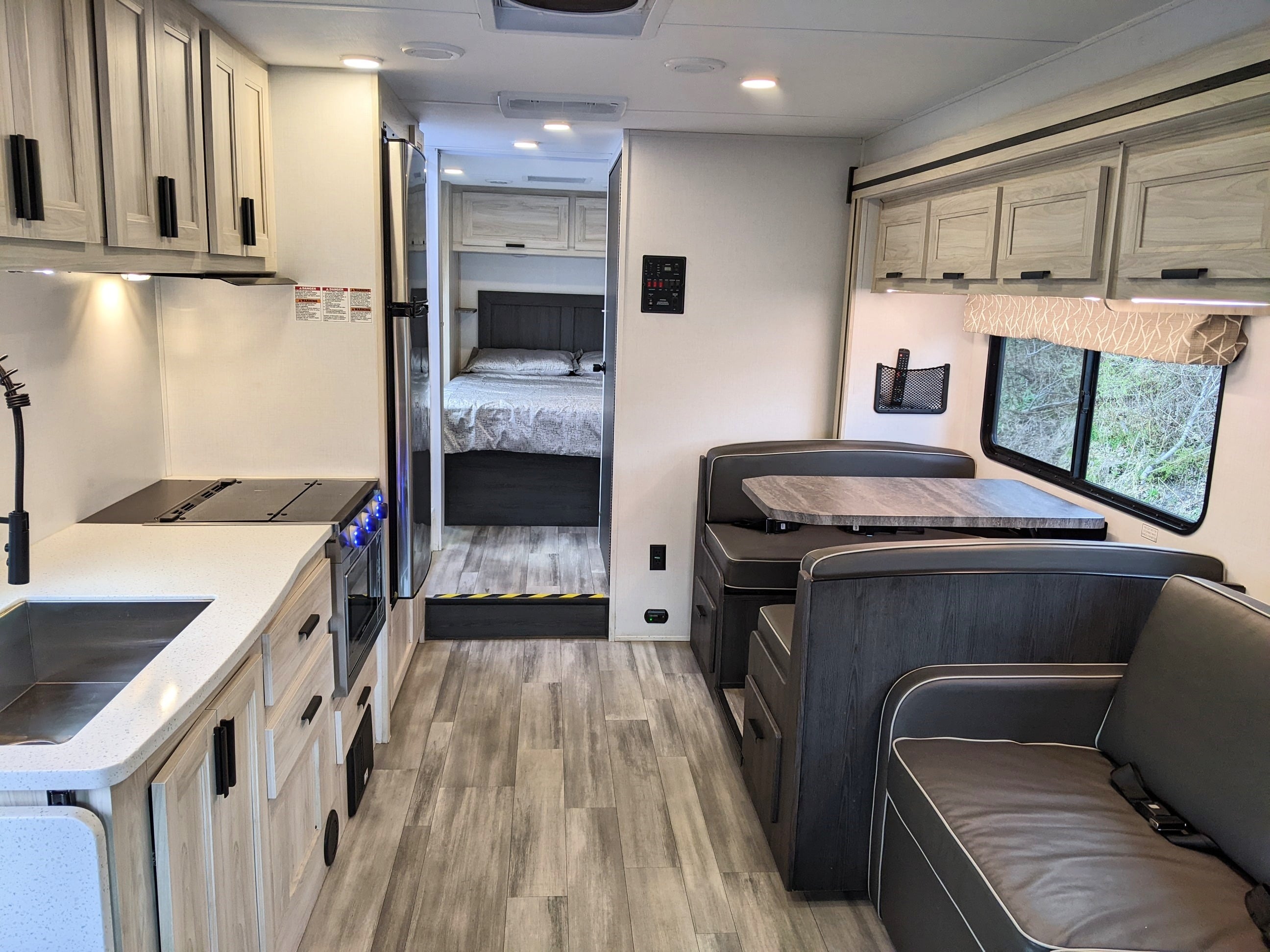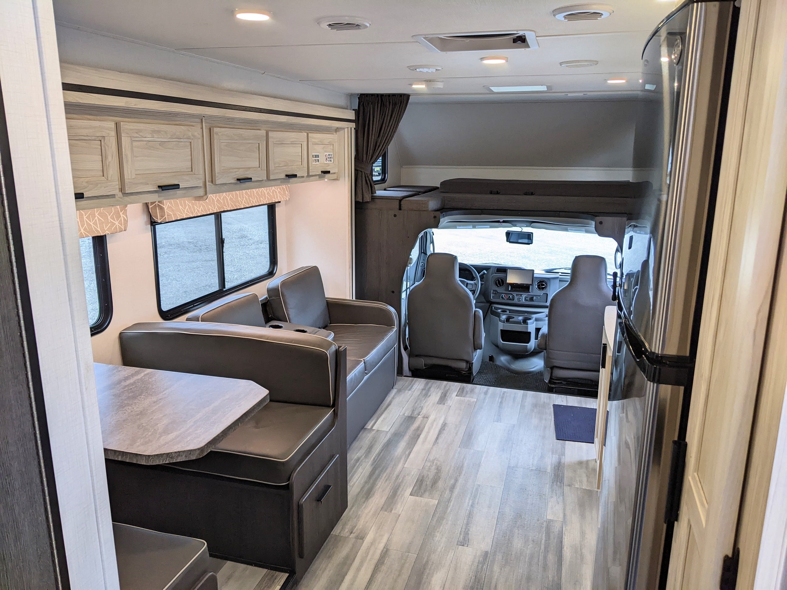This premium motorhome sleeps 6 with a rear walk-around Queen Bed with Upgraded Pillow Top Mattress, a Dinette/Bed, a Sofa/bed, and an overhead Queen Bunk. This motorhome offers the luxuries of a full kitchen with living area with residential vinyl flooring throughout. TV AND refrigerator systems are 12 volt, that means NO GENERATOR NEEDED to watch TV while camping or in transit!